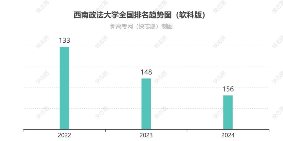 從歷年排名變化趨勢圖可見:西南政法大學(xué)在全國排名2024為第156位、2023為第148位、2022為第133位,最近兩年排名呈下降趨勢,綜合實(shí)力有所減弱。