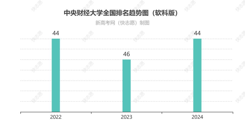 從歷年排名變化趨勢圖可見:中央財經(jīng)大學在全國排名2024為第44位、2023為第46位、2022為第44位,最近兩年排名呈上升趨勢,綜合實力有所提高。